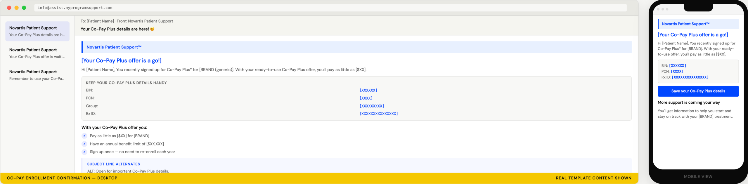 14 enterprise-level email templates across two systems — built to guide patients through co-pay enrollment and complex insurance access moments with clear, health-literate copy.